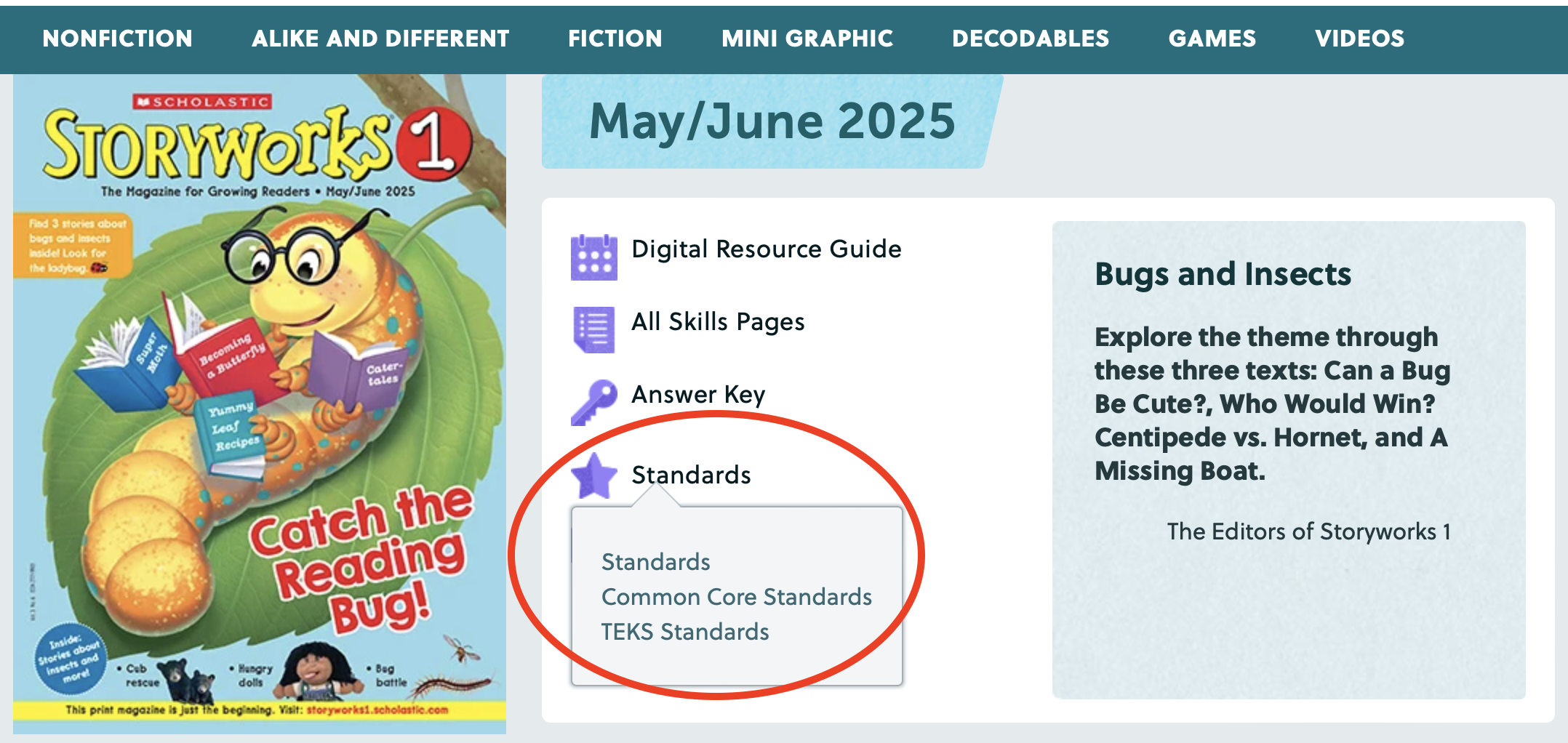 TEKS and CCSS grade-level standards are available for each Storyworks 2 story. On each story page, click on the + next to CCSS or TEKS to reveal the standards.