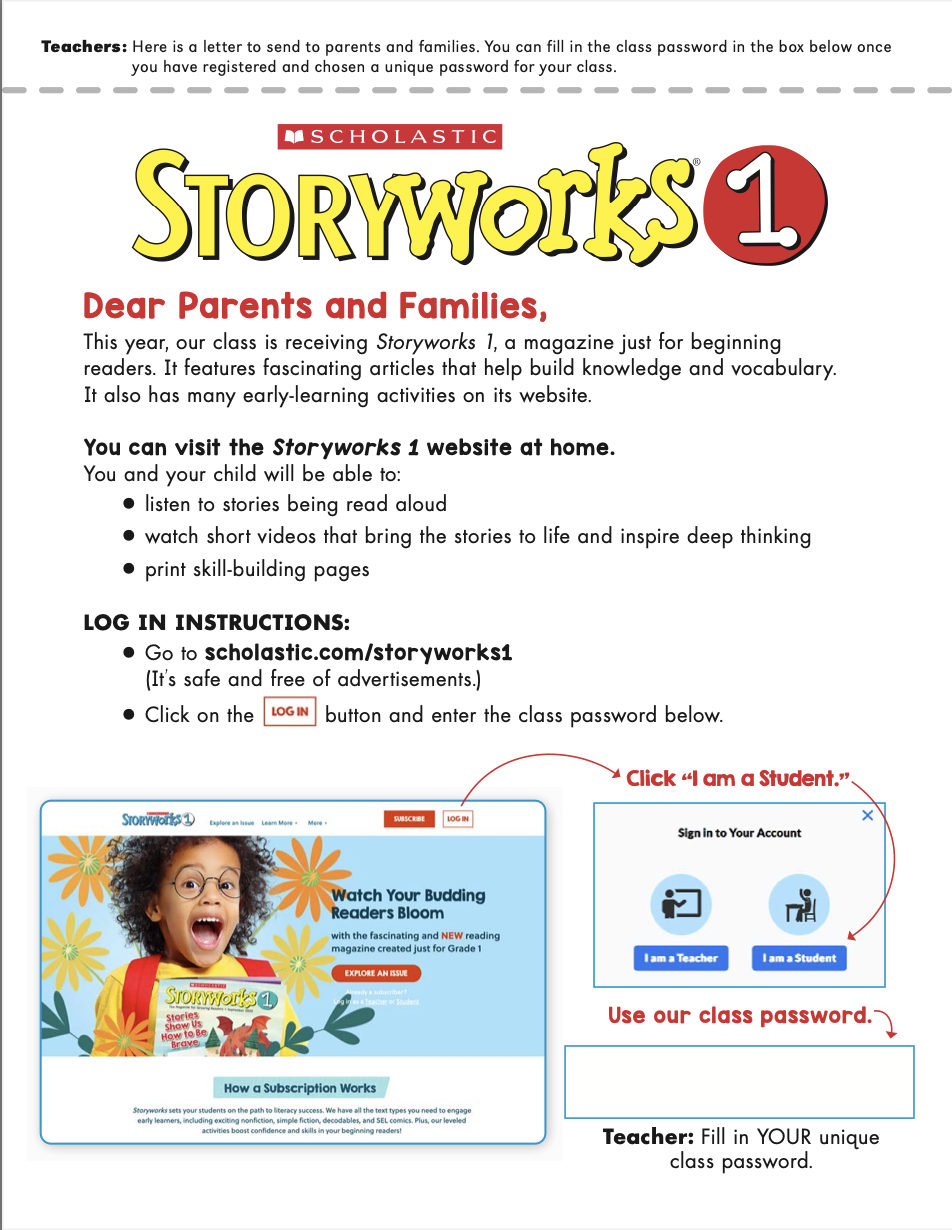 You can use your Send-Home Letter to let families know about Storyworks! This letter introduces families to My Big World online and provides an easy way to send home your Classroom Password. Families use the Classroom Password to sign in to the website.